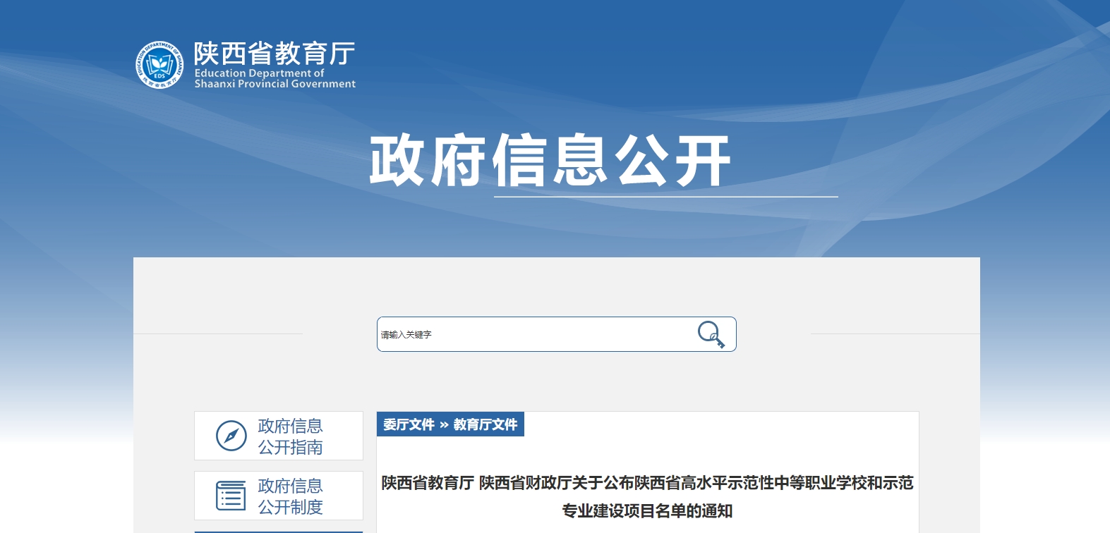 近日,陜西省教育廳、陜西省財政廳發(fā)布陜西省高水平示范性中等職業(yè)學校和示范專業(yè)建設項目名單的通知,將50所陜西省高水平示范性中等職業(yè)學校和150個示范專業(yè)建設項目(以下簡稱“雙示范”建設項目)名單予以公布。