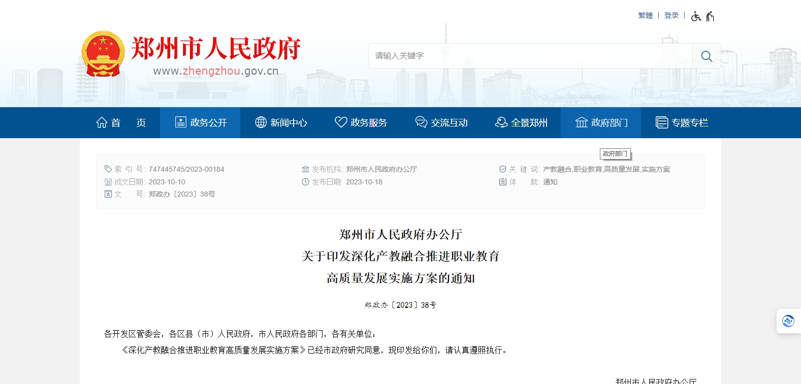 10月18日,鄭州市人民政府辦公廳印發(fā)《深化產(chǎn)教融合推進職業(yè)教育高質量發(fā)展實施方案》(簡稱《方案》)。