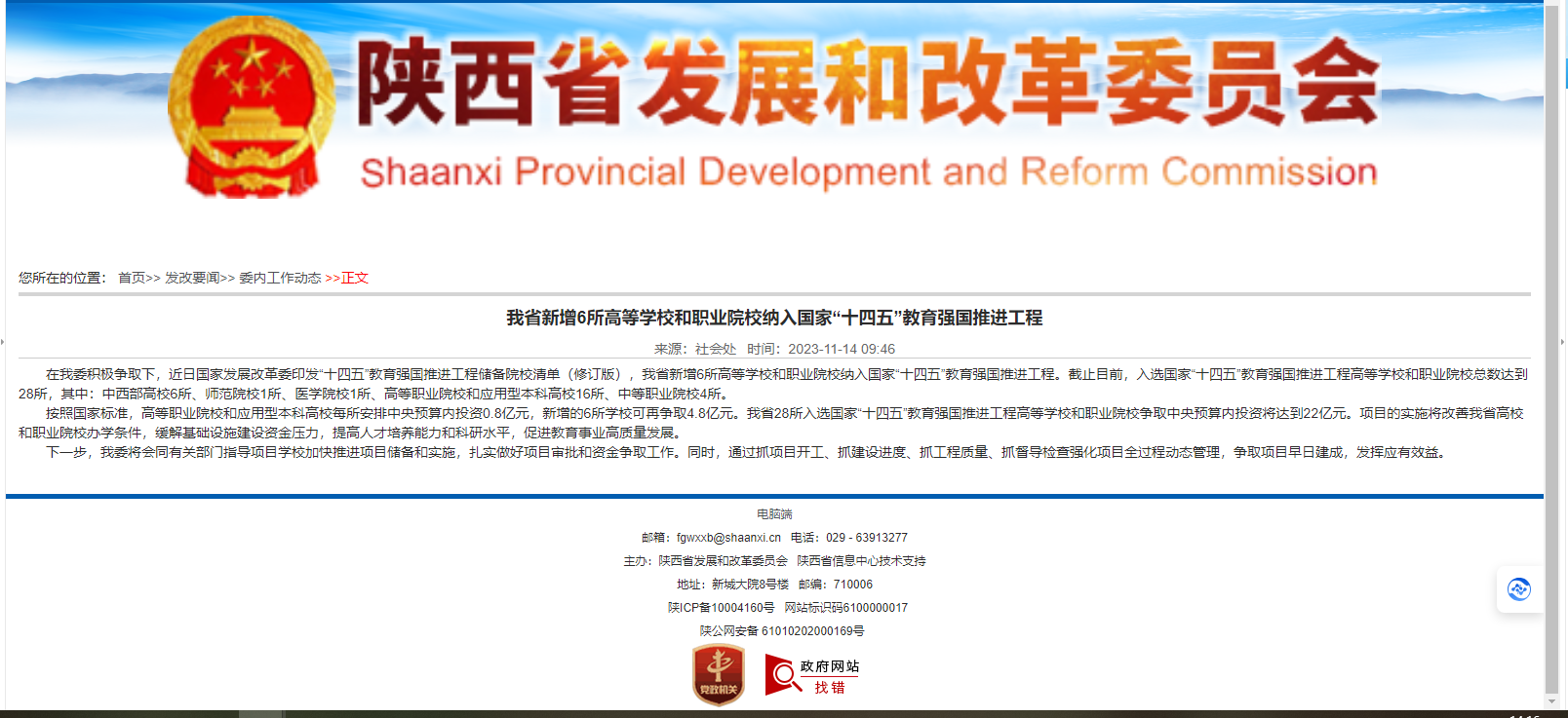 近日,根據(jù)陜西省發(fā)改委官網(wǎng)消息顯示,陜西省新增6所高等學校和職業(yè)院校納入國家“十四五”教育強國推進工程。截止目前,陜西省入選國家“十四五”教育強國推進工程高等學校和職業(yè)院校總數(shù)達到28所,其中:中西部高校6所、師范院校1所、醫(yī)學院校1所、高等職業(yè)院校和應用型本科高校16所、中等職業(yè)院校4所。