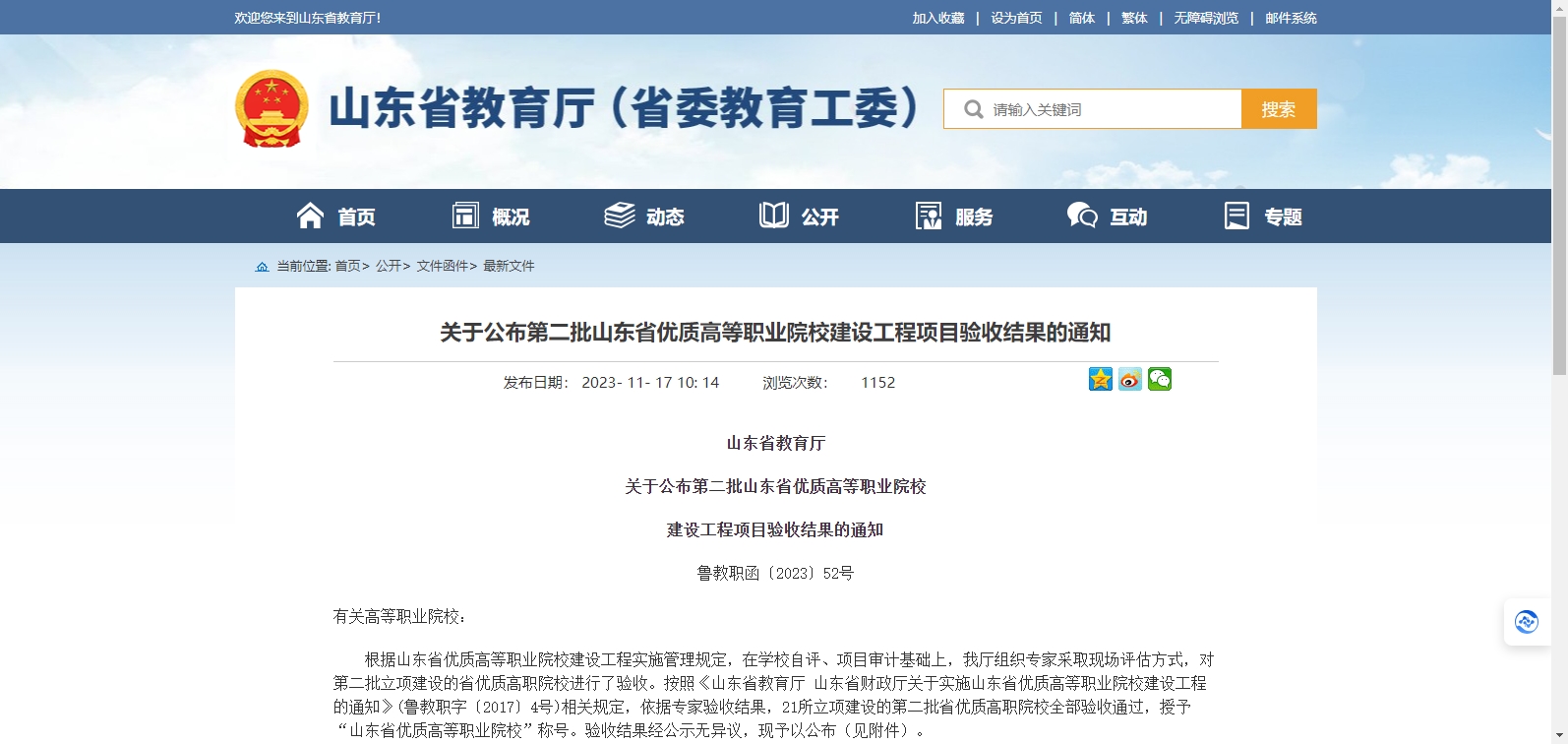 近日,山東省教育廳發(fā)布《關(guān)于公布第二批山東省優(yōu)質(zhì)高等職業(yè)院校建設(shè)工程項目驗收結(jié)果的通知》,按照《山東省教育廳 山東省財政廳關(guān)于實施山東省優(yōu)質(zhì)高等職業(yè)院校建設(shè)工程的通知》(魯教職字〔2017〕4號)相關(guān)規(guī)定,依據(jù)專家驗收結(jié)果,21所立項建設(shè)的第二批省優(yōu)質(zhì)高職院校全部驗收通過,授予“山東省優(yōu)質(zhì)高等職業(yè)院校”稱號。