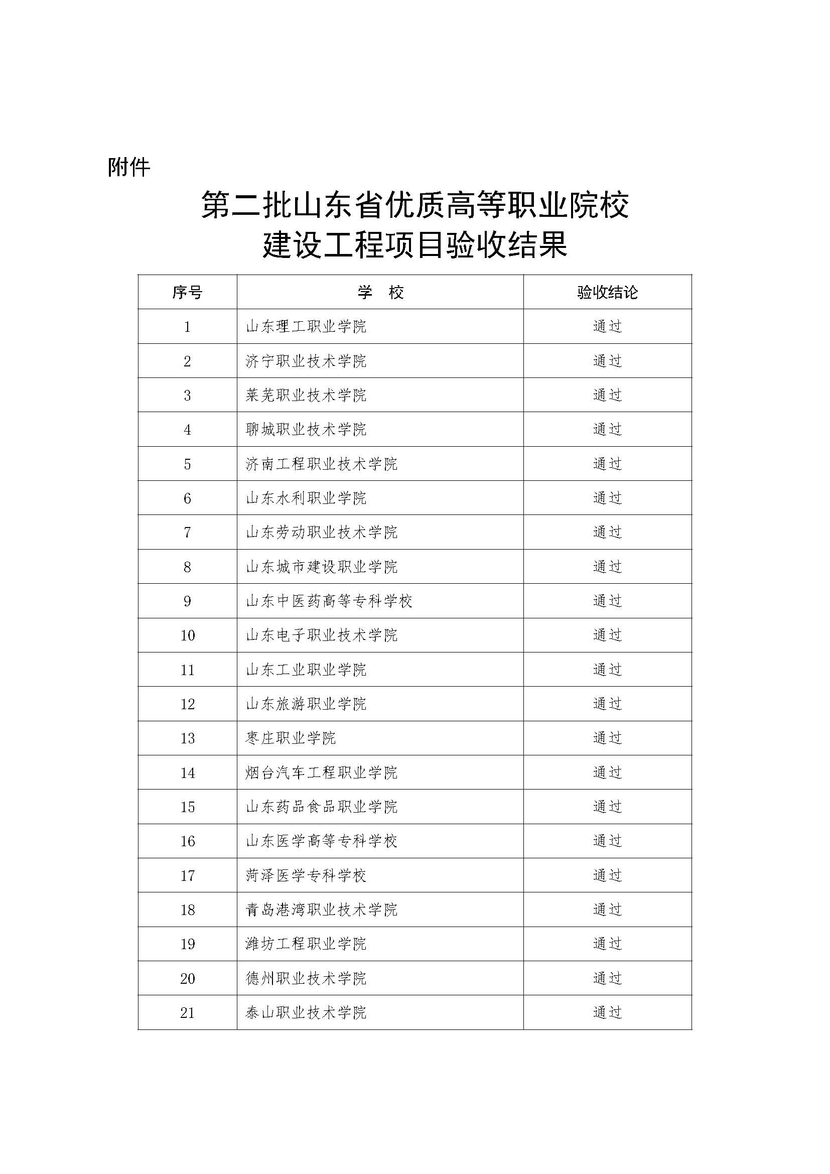 根據(jù)山東省優(yōu)質(zhì)高等職業(yè)院校建設(shè)工程實施管理規(guī)定,在學校自評、項目審計基礎(chǔ)上,我廳組織專家采取現(xiàn)場評估方式,對第二批立項建設(shè)的省優(yōu)質(zhì)高職院校進行了驗收。按照《山東省教育廳 山東省財政廳關(guān)于實施山東省優(yōu)質(zhì)高等職業(yè)院校建設(shè)工程的通知》(魯教職字〔2017〕4號)相關(guān)規(guī)定,依據(jù)專家驗收結(jié)果,21所立項建設(shè)的第二批省優(yōu)質(zhì)高職院校全部驗收通過,授予“山東省優(yōu)質(zhì)高等職業(yè)院?!狈Q號。驗收結(jié)果經(jīng)公示無異議,現(xiàn)予以公布(見附件)。